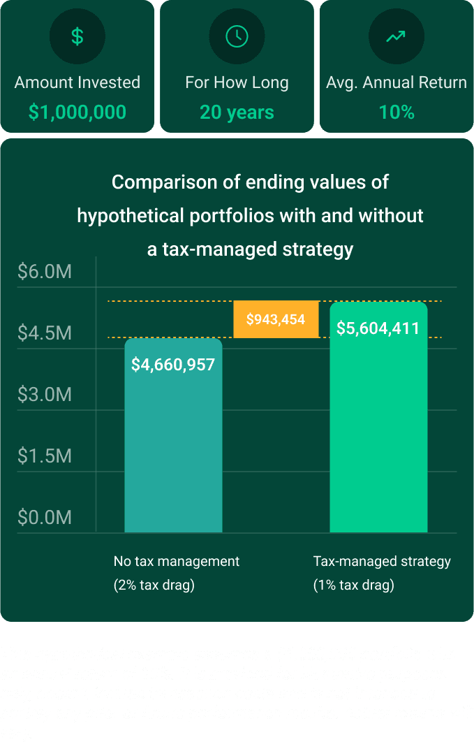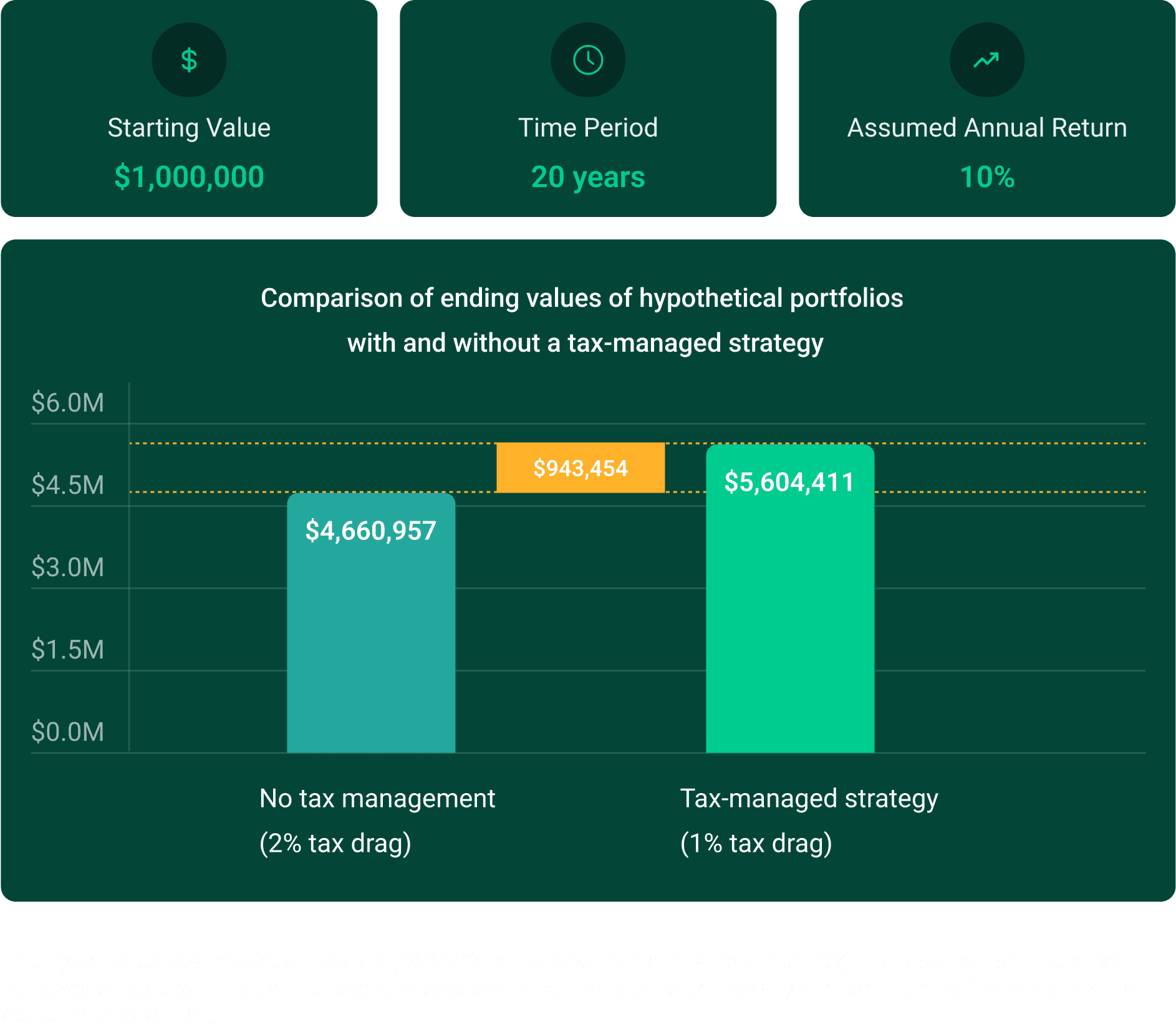 Here, we’ve used hypothetical portfolios to show how a tax-managed strategy can reduce an investor’s tax burden and allow those savings to remain invested—and growing—over time. This graph assumes a starting portfolio value of $1 million and shows hypothetical annual tax drag of 2% vs. a tax-managed portfolio with a hypothetical 1% tax drag. This makes it easy to see the potential growth in a tax-managed portfolio over 20 years.